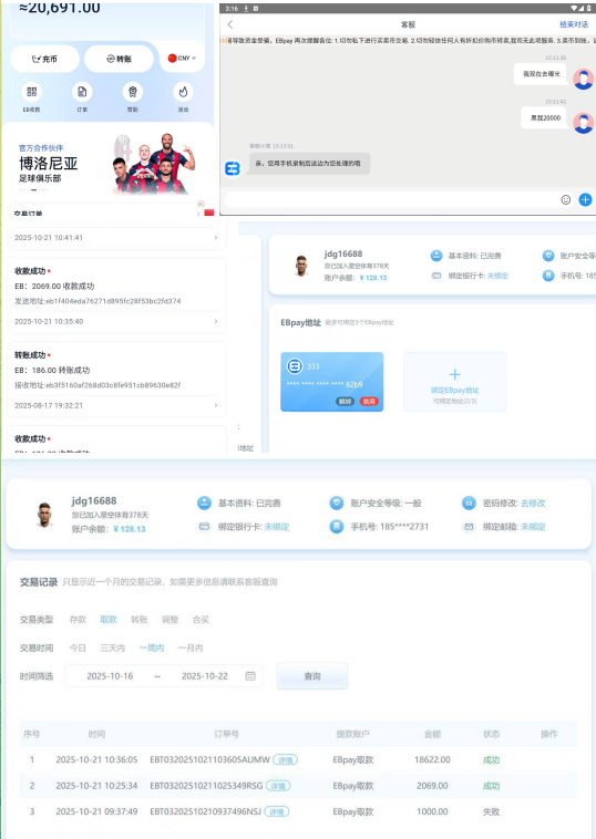 EB强制要求绑定邮箱也就算了,手机号码接不了只能修改手机号码,修改完以后直接变红色感叹号限制你转账,联系在线客服,要求提供资金来源证明,在修改手机号码之前已经提供过一次了,现在又要提供一边,好的我提供了,跟我说又要手机登录,你妈的,给你们发的视频里面有且只有一个EB提款地址尾号82b9,提款金额两次一次18622.00 ,一次2069.00,EB到账也是2069和18622并且是视频录制官网视频,请问我还要怎么证明?在线客服一口一个为了安全你妈的你们强制绑定邮箱就安全了?我自己的钱还要这么为难我,大家可想而知,这种狗庄开发的平台是真的不能用!!!!!!